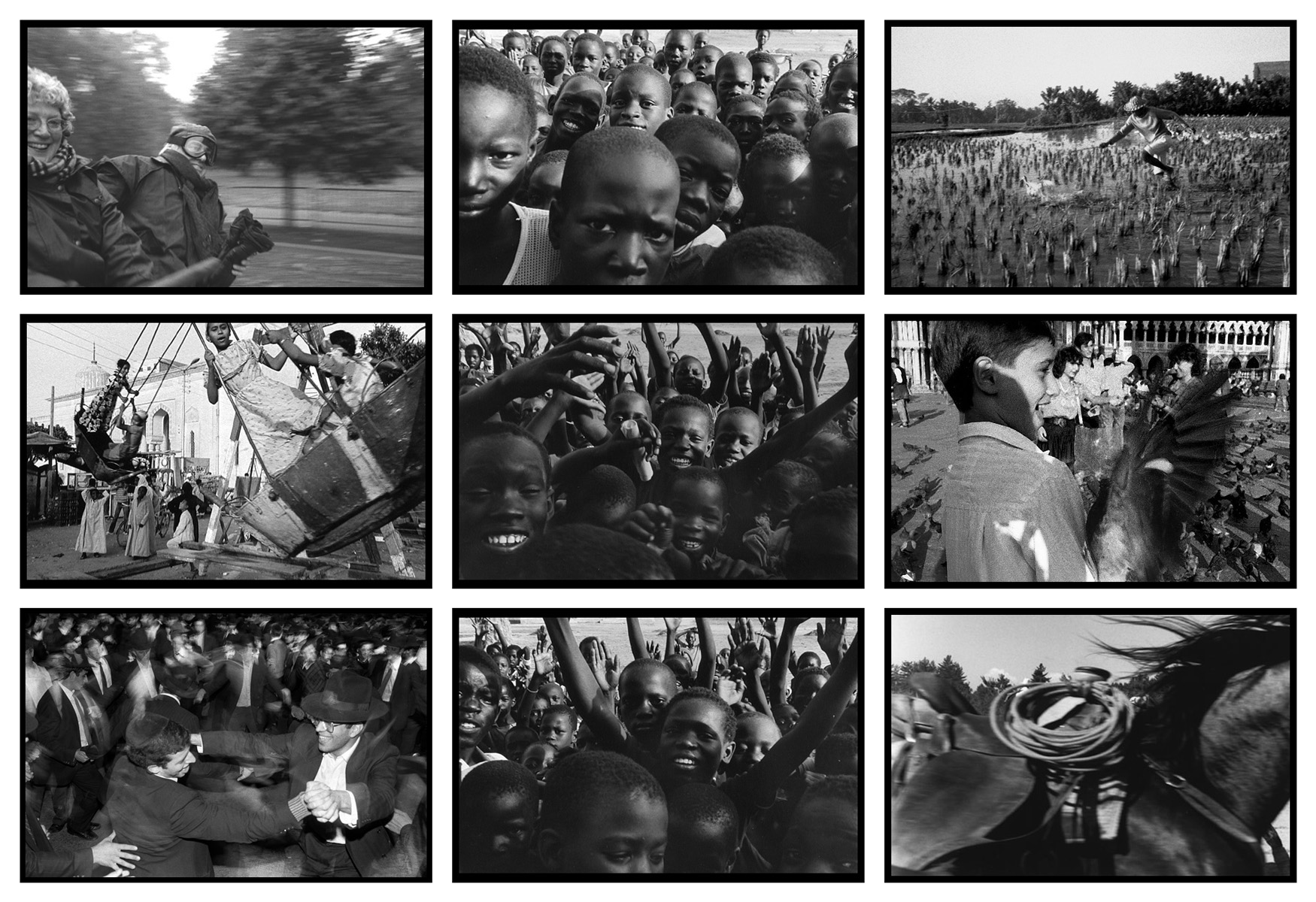 Momentum is a collection of more than 100 of Katzenstein’s black and white images from around the world that are linked together through movement. The exhibition, assembled in long grids of 12×18 prints, demands in the simple process of viewing another kind of motion. No modern trains, planes and automobiles here, but rather the singular grace of a boy chasing a lamb, along with the passion of a marching woman baring it all for peace; a man walks by on a London street, another runs by in Kamakura pulling a rickshaw. Zulu men dance in South Africa in the same room with a Hula Hoop-er in France and a Mardi Gras woman flaunting it in Tokyo. Emblematic of one of the oldest forms of transportation, on one wall horses run wild across three panels above playful Bhutanese men. On another wall, harnessed and ridden horses rush to the finish line. They are surrounded by images from Italy, Egypt and Ecuador. Katzenstein has also included imagery of movement where there is none, just the hand of humanity making the way for someone. This body of work comes out of the great 20th century school of traditional documentary photography, and the black and white compositions appeal to the viewer by showing how the most recognizable common motion can become art, and how the unusual motion of distant cultures can become sublime.
